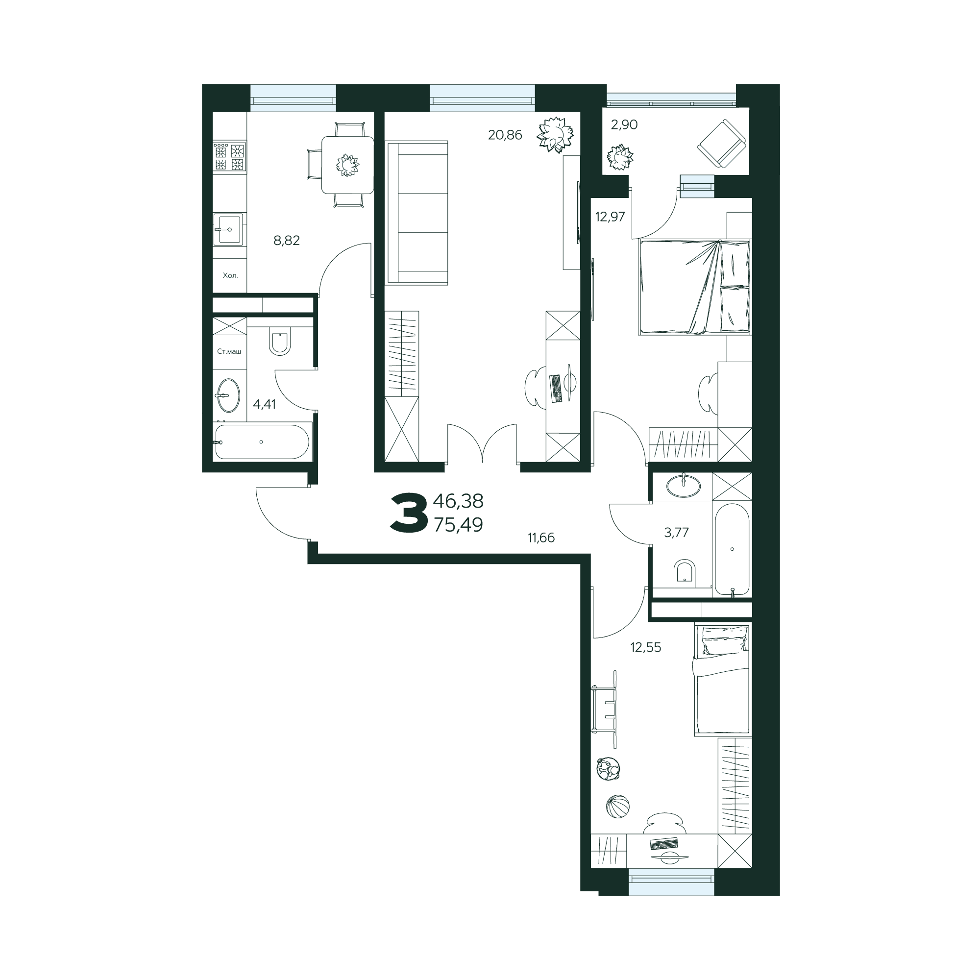 3-комнатная квартира № 41 76,49 м