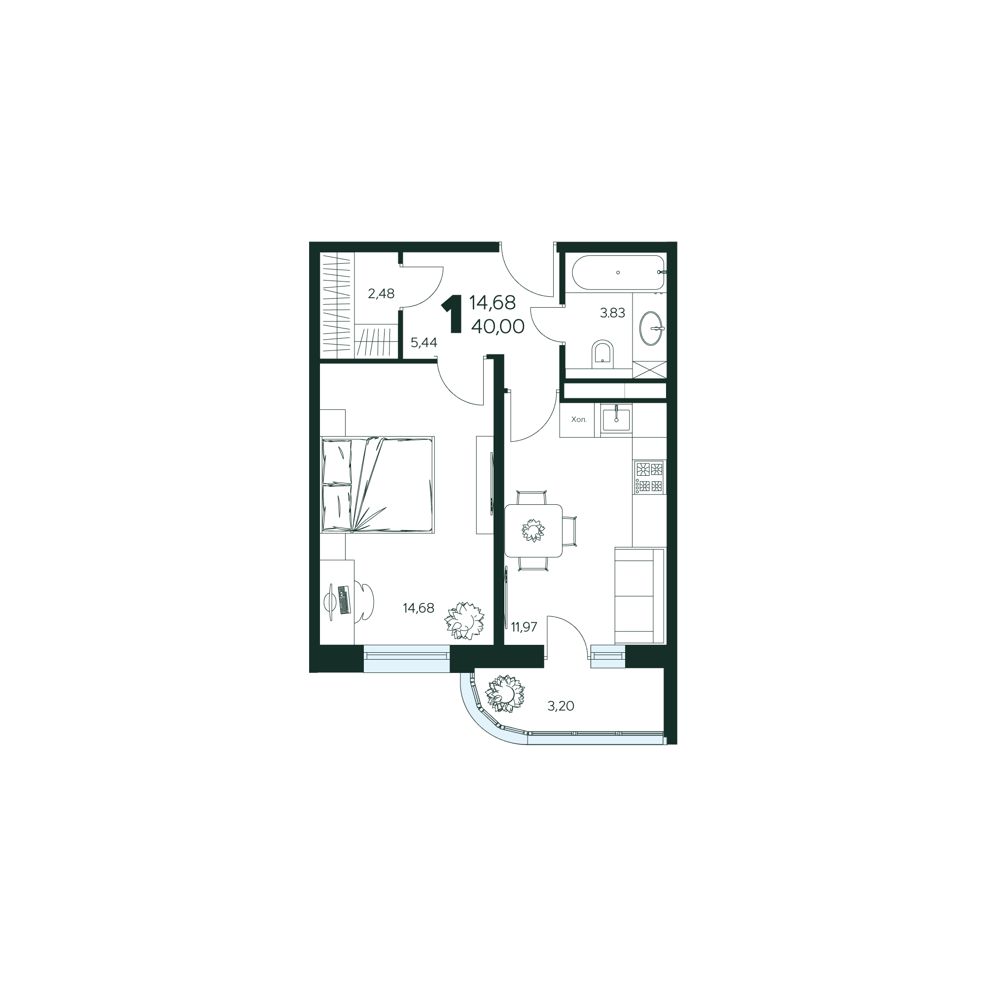 1-комнатная квартира № 128 40 м